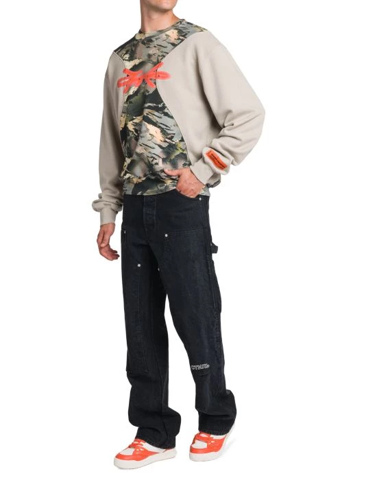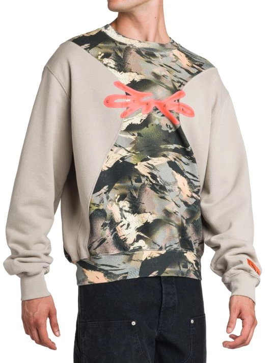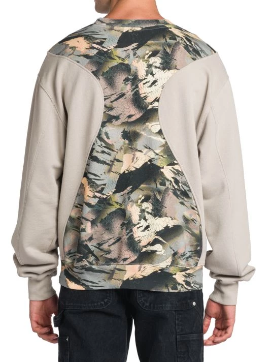 A pieced camo panel lends style and dimension to this printed crewneck sweatshirt.