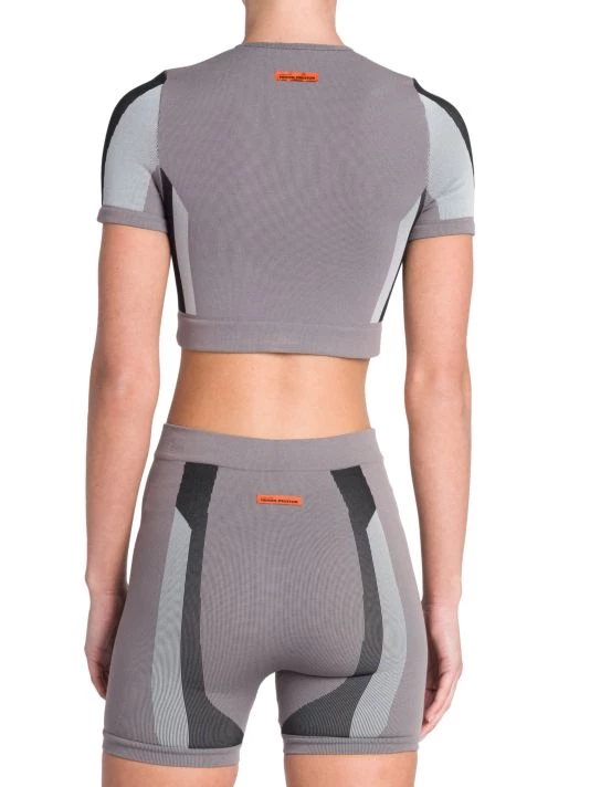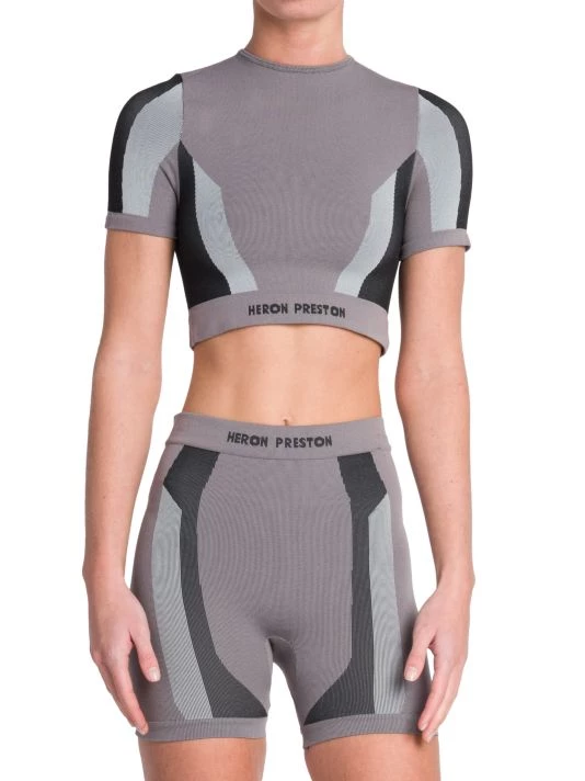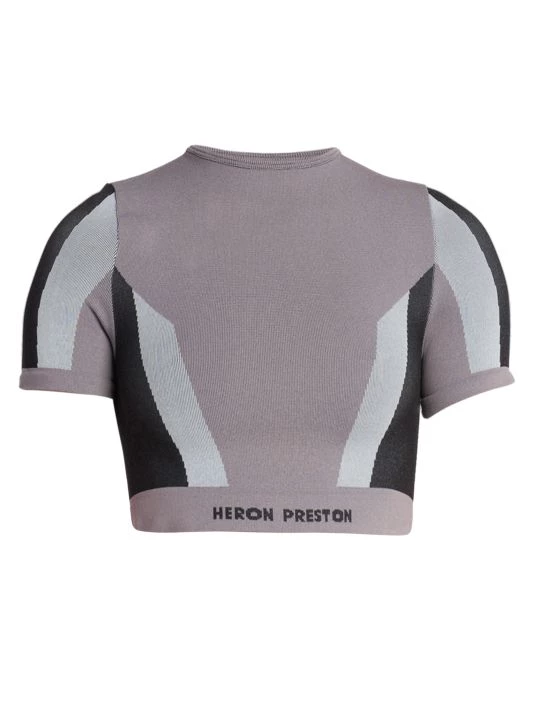 Cut in an ultra-cropped-silhouette, Heron Preston’s formfitting top boasts dimensional colorblocking and a banded logo hem.