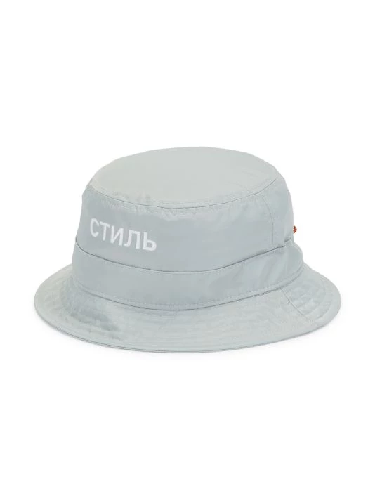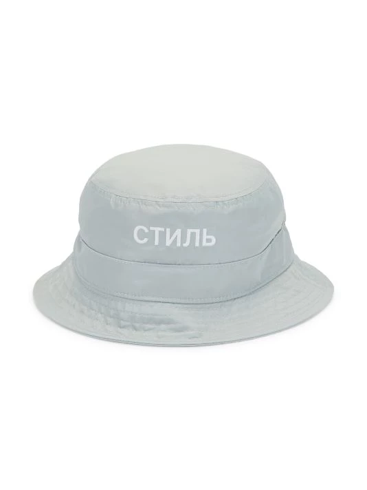 Embroidered with a signature logo across the front, this stretch nylon bucket hat has a glossy finish.