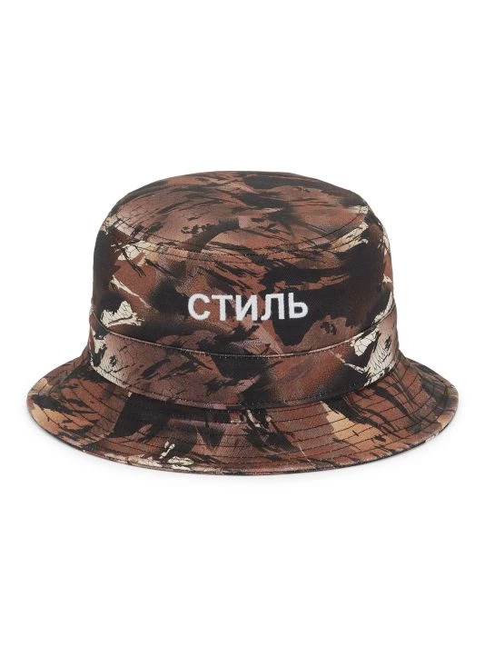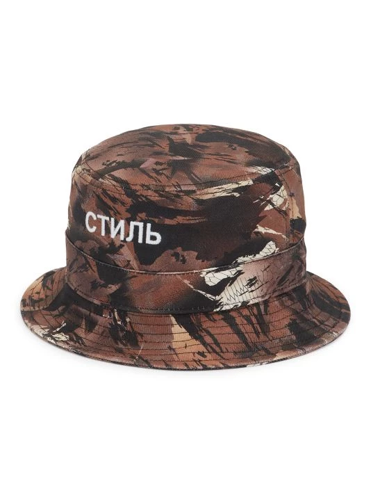 Embroidered with a signature logo across the front, this stretch nylon bucket hat features an abstract camouflage print.