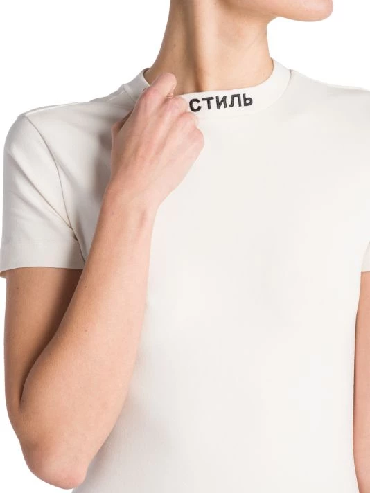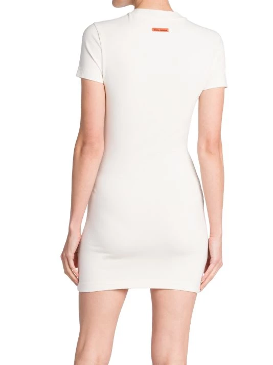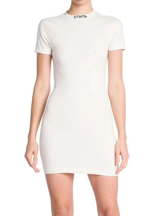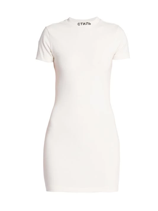 Cut in a body-con silhouette, Heron Preston’s short-sleeve minidress is elevated by contrast brand embroidery at the mock turtleneck.