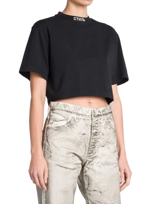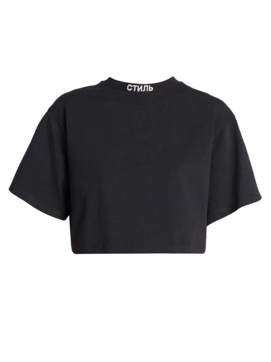 Cut in a cropped silhouette, Heron Preston’s boxy T-shirt is elevated by contrast embroidery at the neckline.