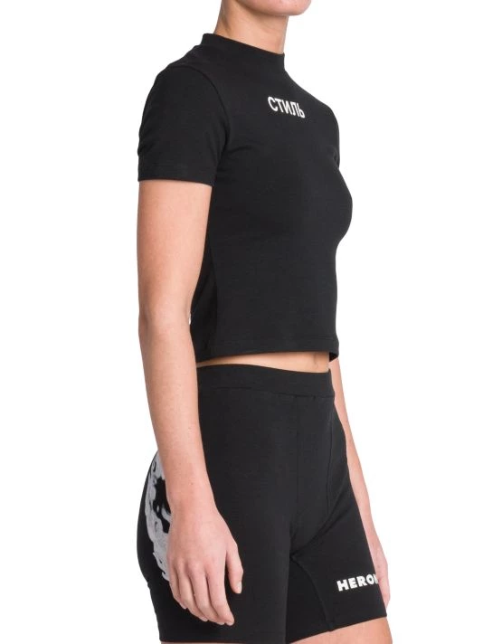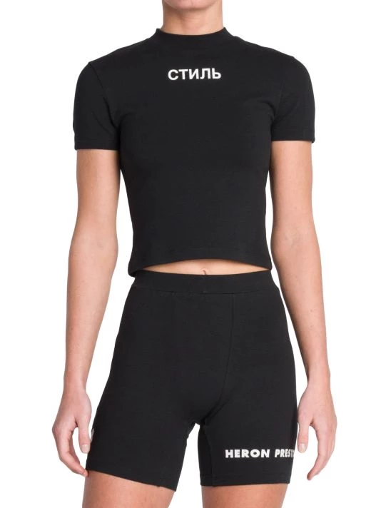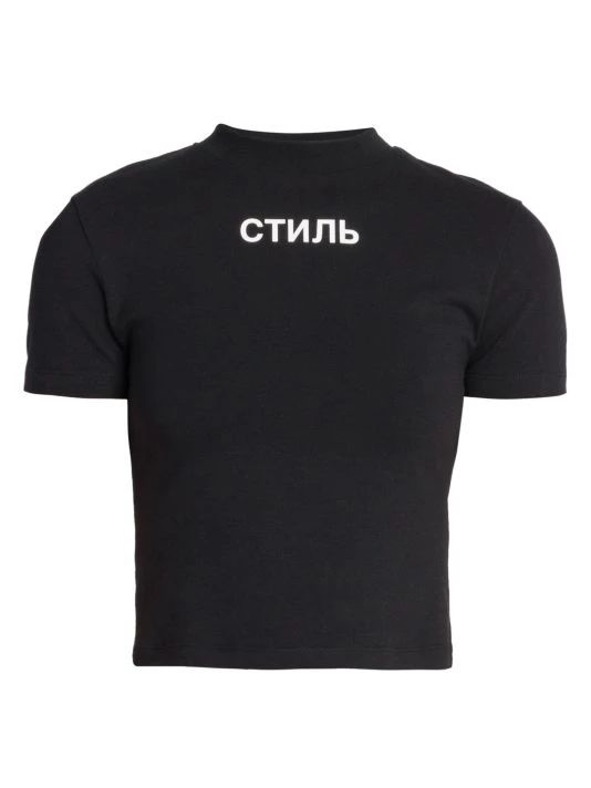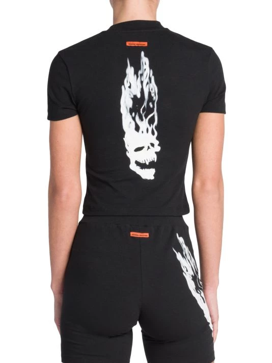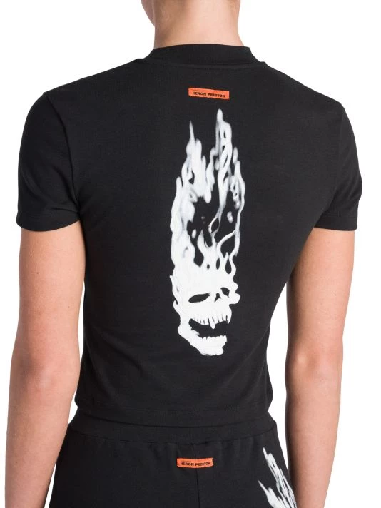 Cut in a cropped silhouette, Heron Preston’s formfitting T-shirt features a contrast logo at the chest and flaming skull graphic at the back.