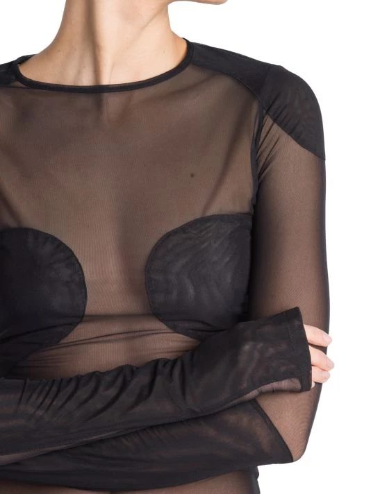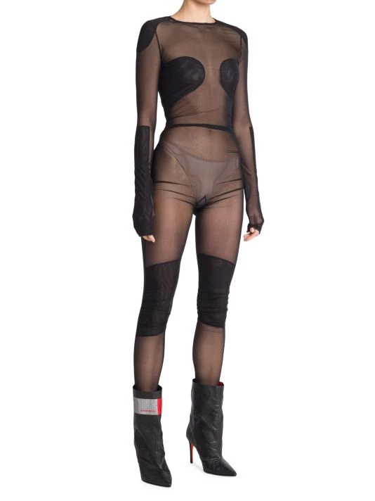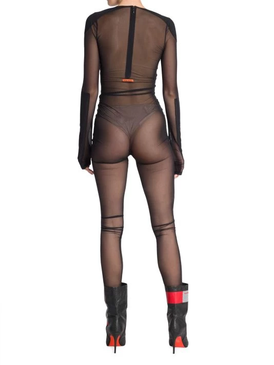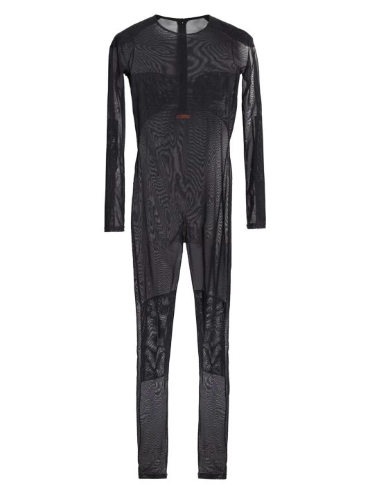 Heron Preston’s sheer mesh jumpsuit is complete with solid complementary patches throughout.