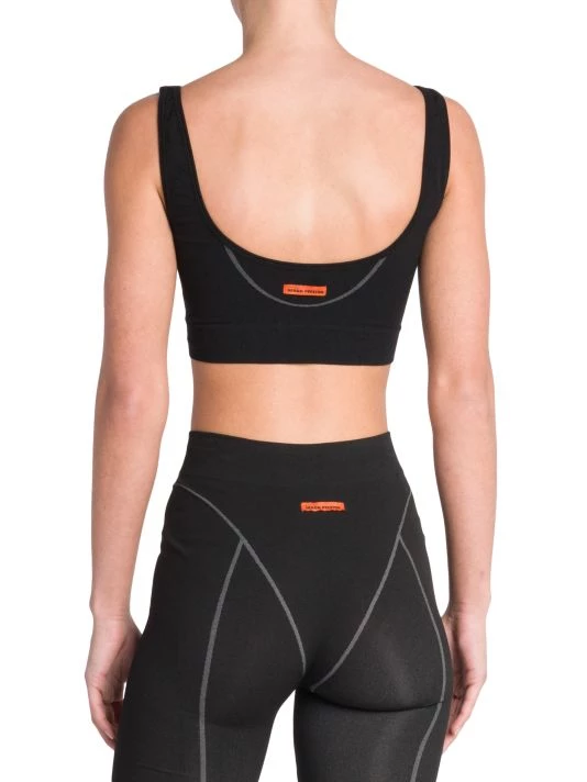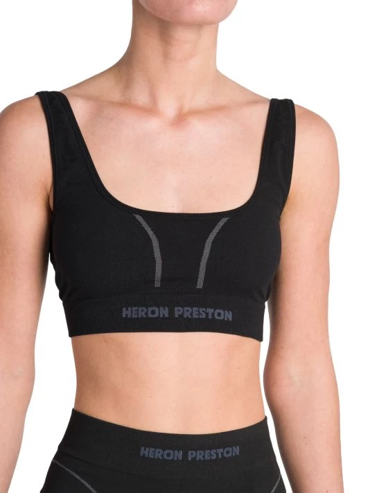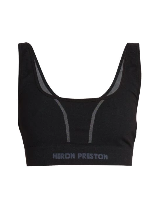 Heron Preston’s sports bra is elevate by a banded logo hem and plunging scoopback.
