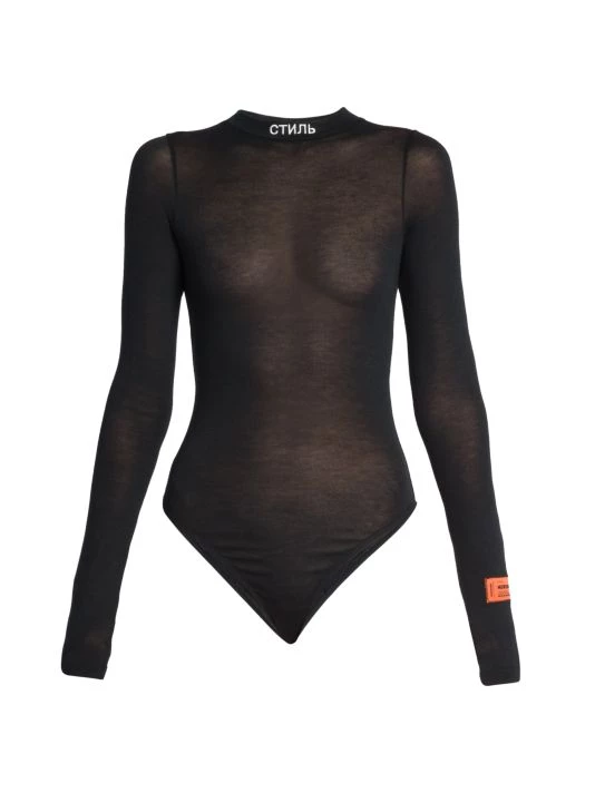 Heron Preston’s semi-sheer bodysuit is elevated by contrast embroidery at the mock turtleneck and a logo patch at the sleeve.