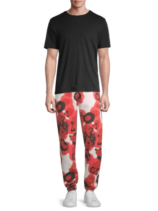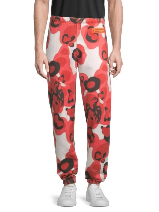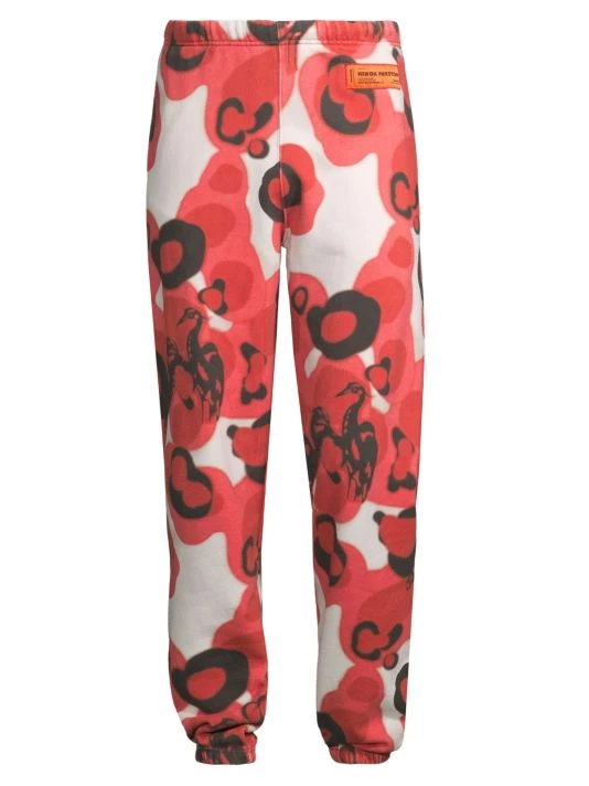 These jogger pants feature an abstract camouflage print layered with the silhouettes of heron birds, a nod to the brand’s name.