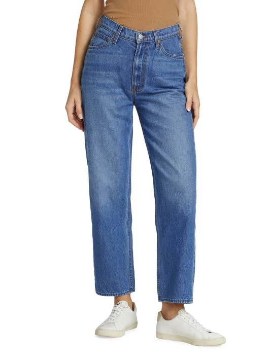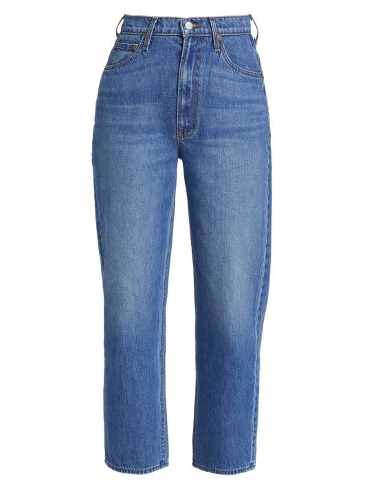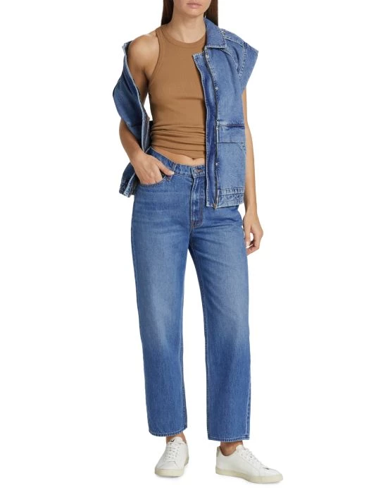 Cut from rigid denim, Mother’s Double Stack ankle jeans feature a high-rise, straight-leg silhouette with five pockets and contrast top-stitch.