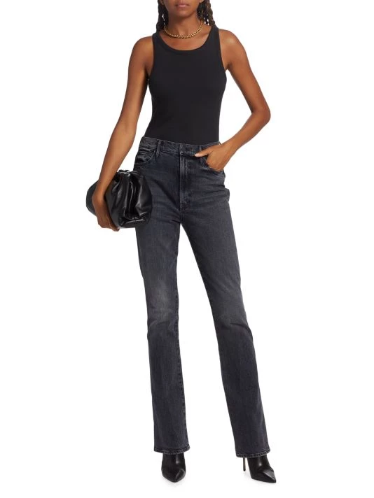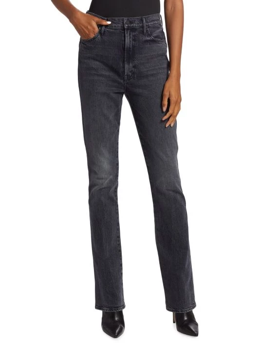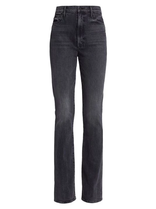 Mother’s high-waisted Smokin’ Double-Heel jeans boast unique whiskering and a slim fit.
