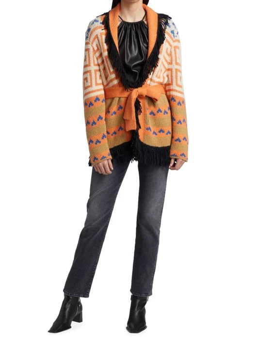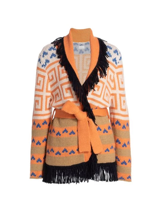 Soft alpaca-blend belted cardigan with folk-inspired fringed trim and intarsia patterning.