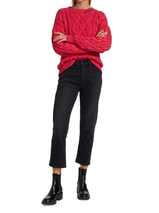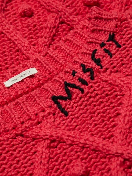 Embroidery embellishes the neckline of this vibrant cable-knit cotton sweater.