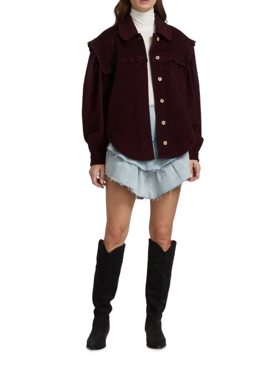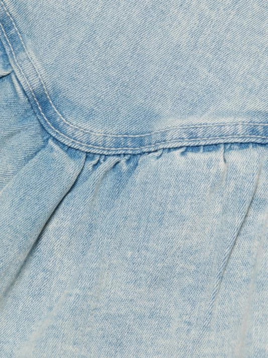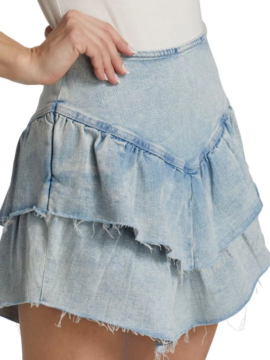 Crafted of denim, this tiered ruffle miniskirt boasts a raw hem for a worn-in look.