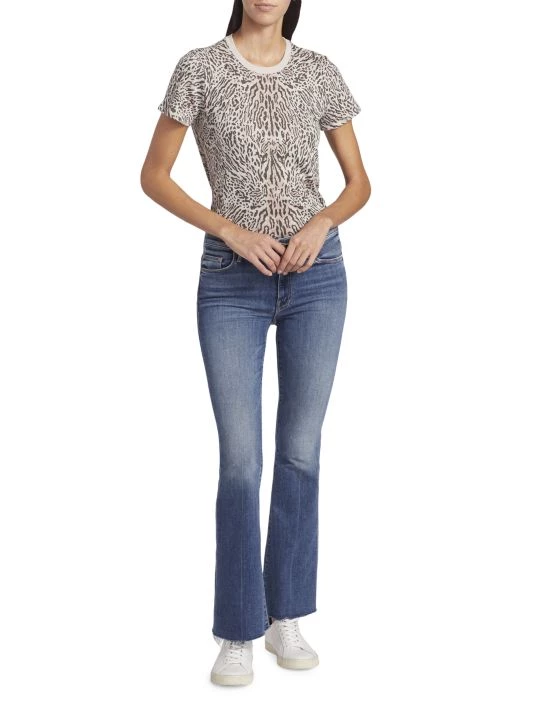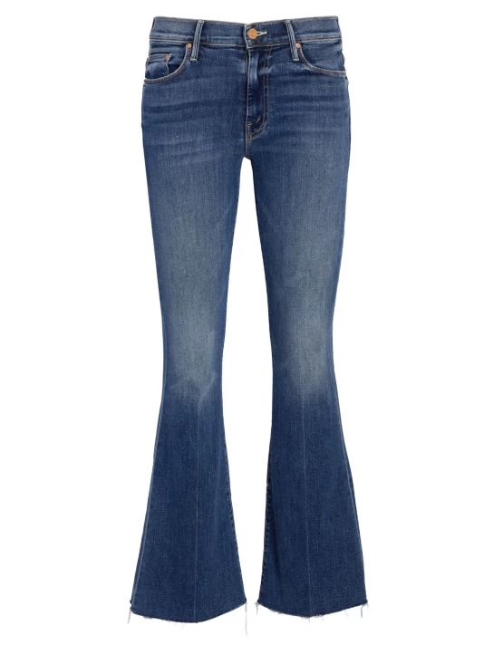 Made of stretch-denim, these flared leg jeans are detailed with distressed hems.